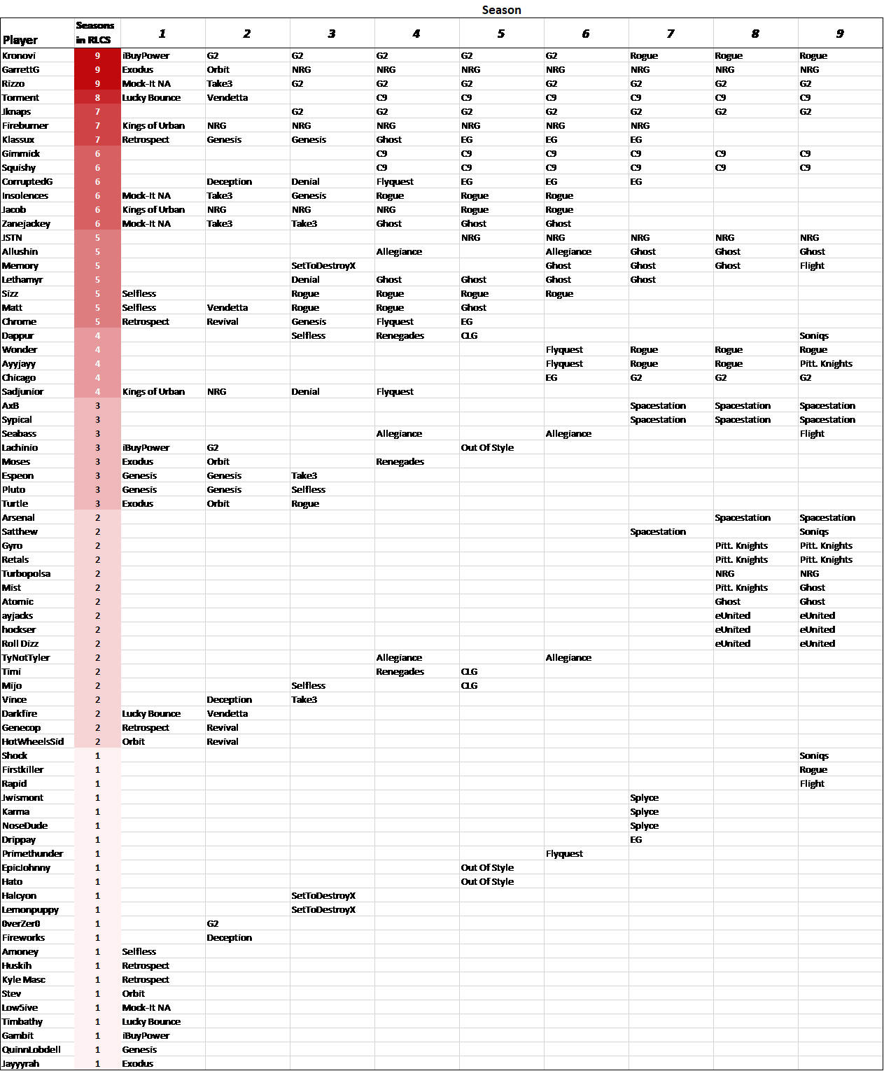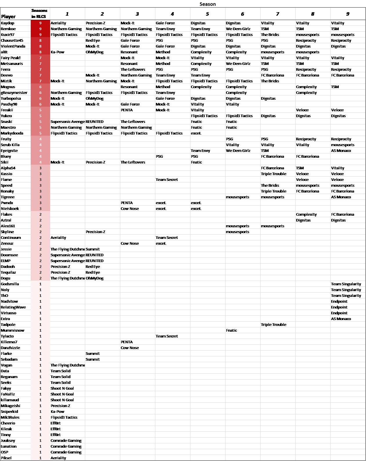 I can’t wait to see how this will look in another 8 seasons. I wonder if any of the six players who have played every season will keep their streak alive, or, if the best player in RLCS history hasn’t even taken the pitch yet.