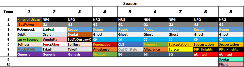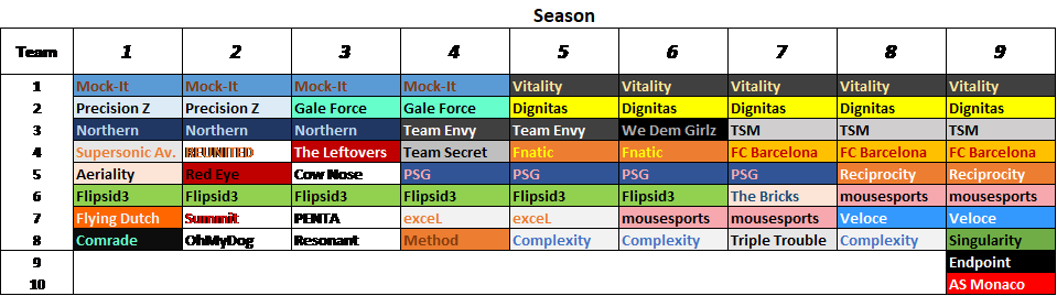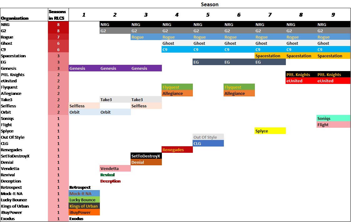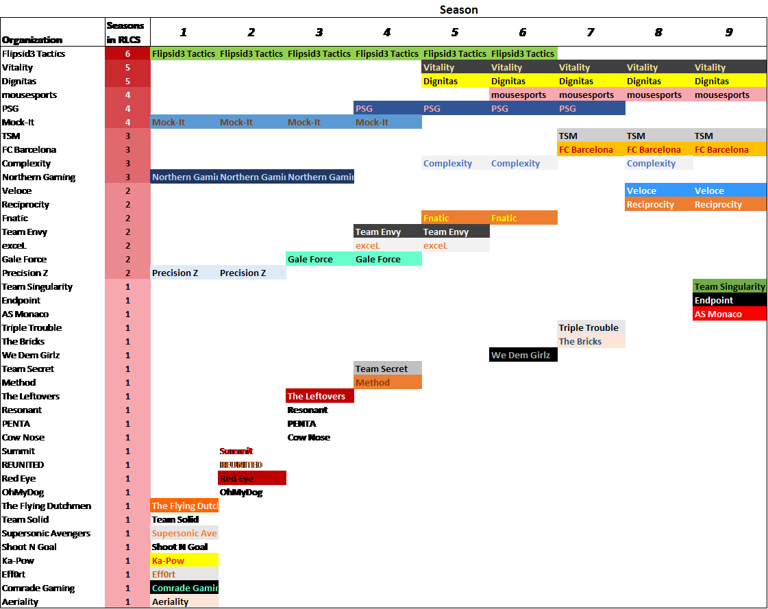 Season 9 is the only season in RLCS history (NA & EU) where all organizations have returned from the previous season.Dappur is the one of the only players to return to RLCS after being away for 3 consecutive seasons. Flame and Skyline have done the same.