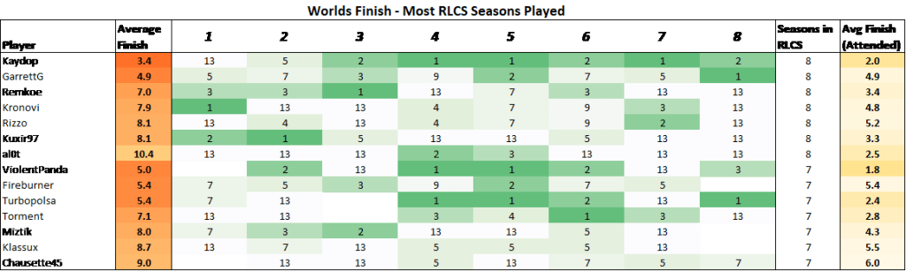 All Players by Worlds Finish. Players who didn’t make Worlds that season received a placing of “13th”.Top 15 players by how they finished at Worlds, counting only World Championships that they’ve attended.7 Players have played in every Season of RLCS. Next season this number will drop to 6 with al0t leaving the League.GarrettG is the only player to attend every RLCS ChampionshipTurboGOATsa is the only player to win 4 World Championships. Kaydop is the only to make 6 World Finals.al0t is the only player to play in every RLCS and miss 6 World ChampionshipsTurtle is the best player of all time and space.If you have JSTN, Garrett, or Fireburner on your team, you are very likely to win your region.