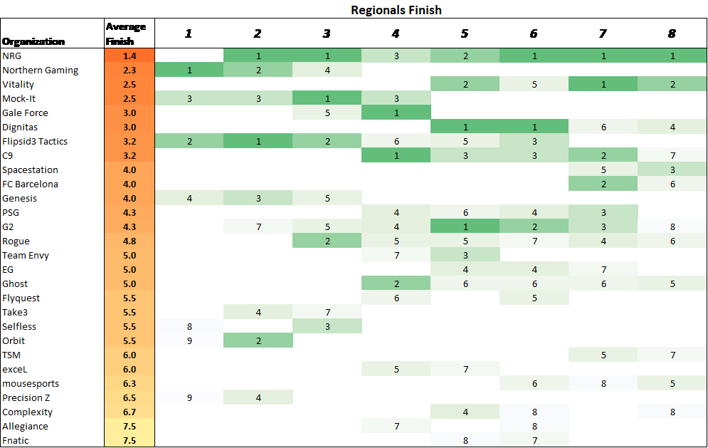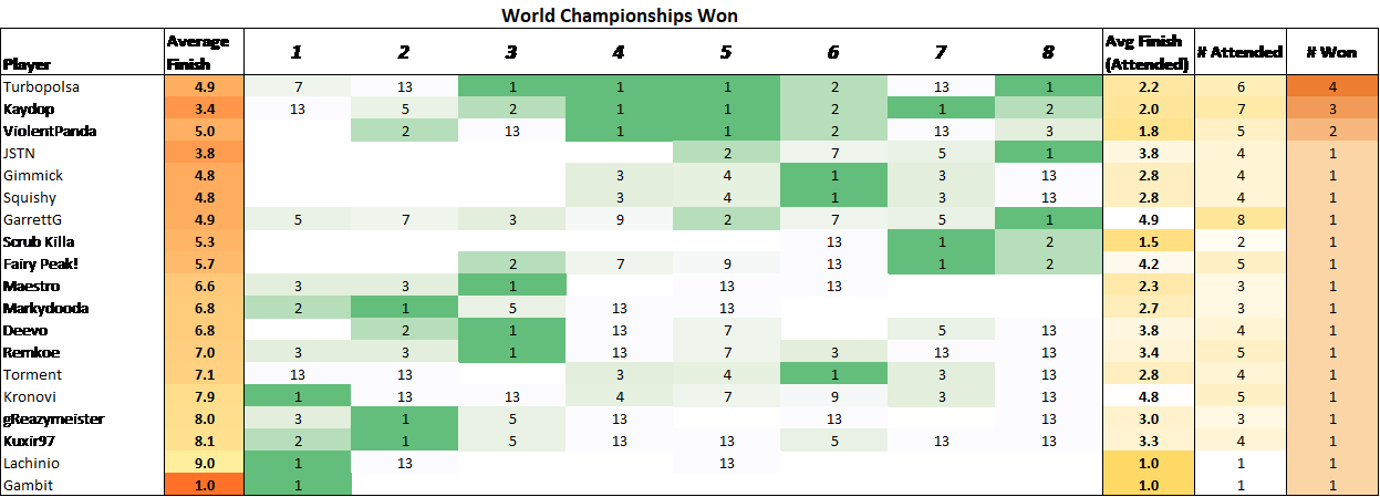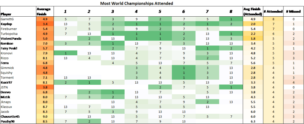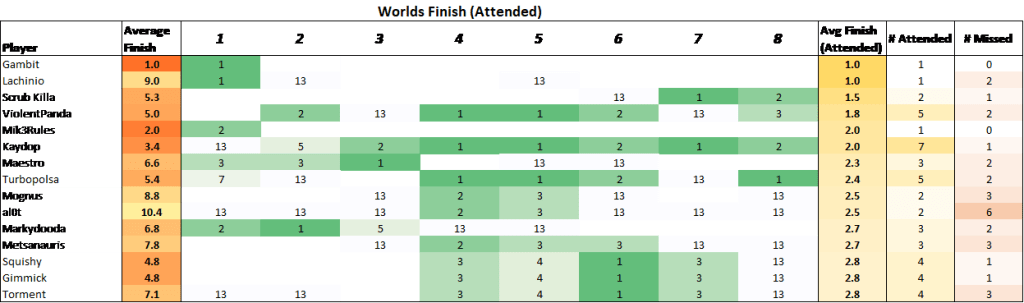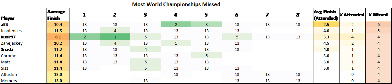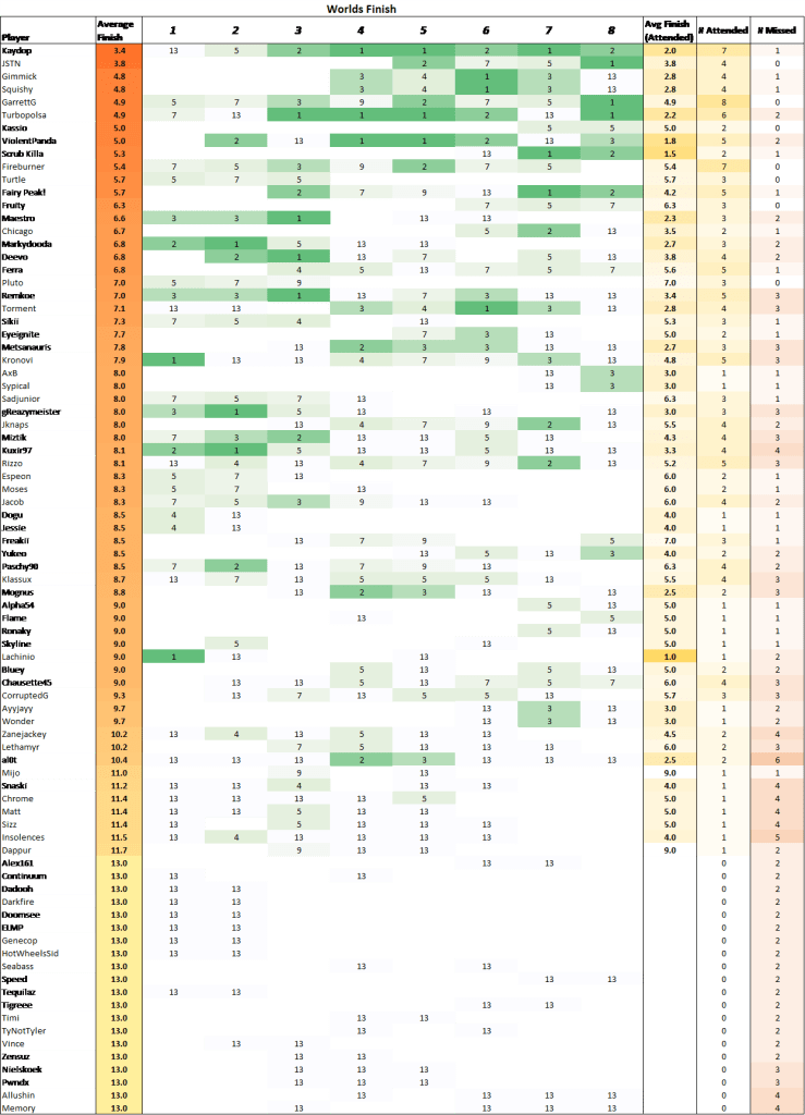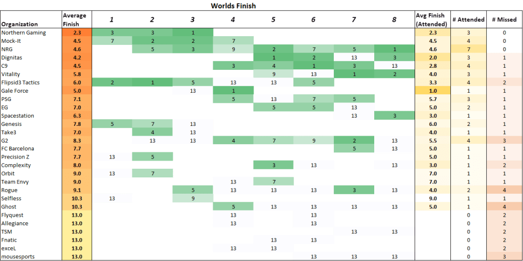Orgs that miss the World Championships receive a placing of “13th”.