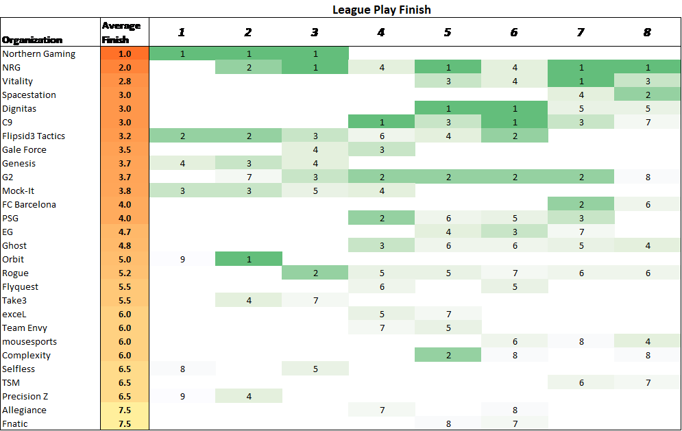 Note this is cumulative win percentage. The more time that passes the harder it is to accumulate percentage points.Top 2 at 8 Majors and won 3. Note than RLCS Summer Series is technically a minor, but included RLCS caliber teams.